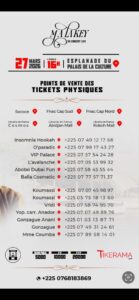 Les points de ventes pour l’achat des tickets du show sont déjà connus. Le public Abidjanais pourra se procurer les tickets à Sococe , Fnac Cap Sud, Fnac Cap Nord, Librairie de France Cosmos, Librairie de France Abidjan Mall, Librairie de France KOKOH Mall. Et bien d’autres points que voici.